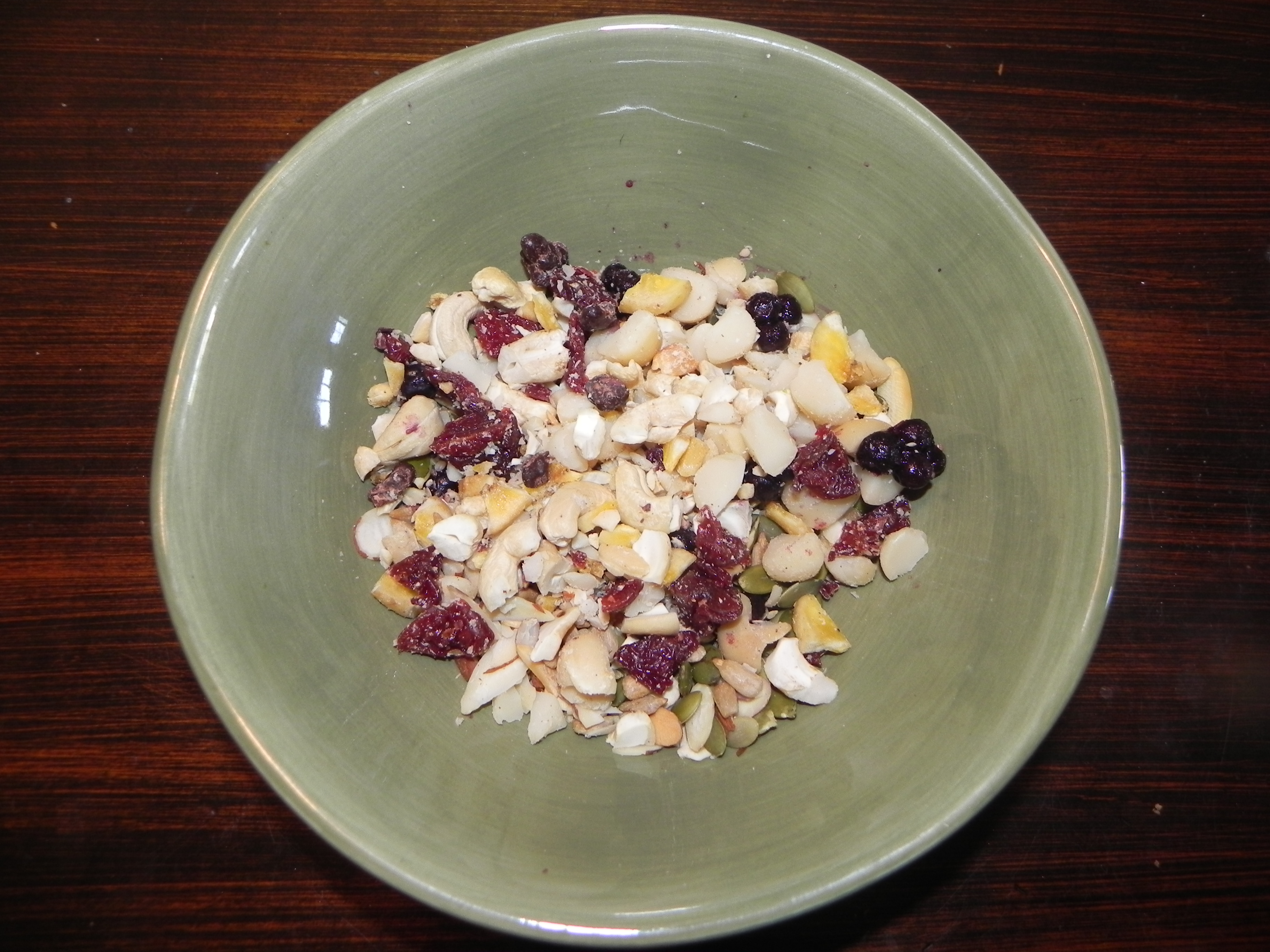 Next I poured a handful of the bigger nuts: macadamia (love!), cashews, almonds, walnuts, etc. and dried banana chips onto a cutting board and chopped it up into crunchy little nuggets to make it easier to eat.