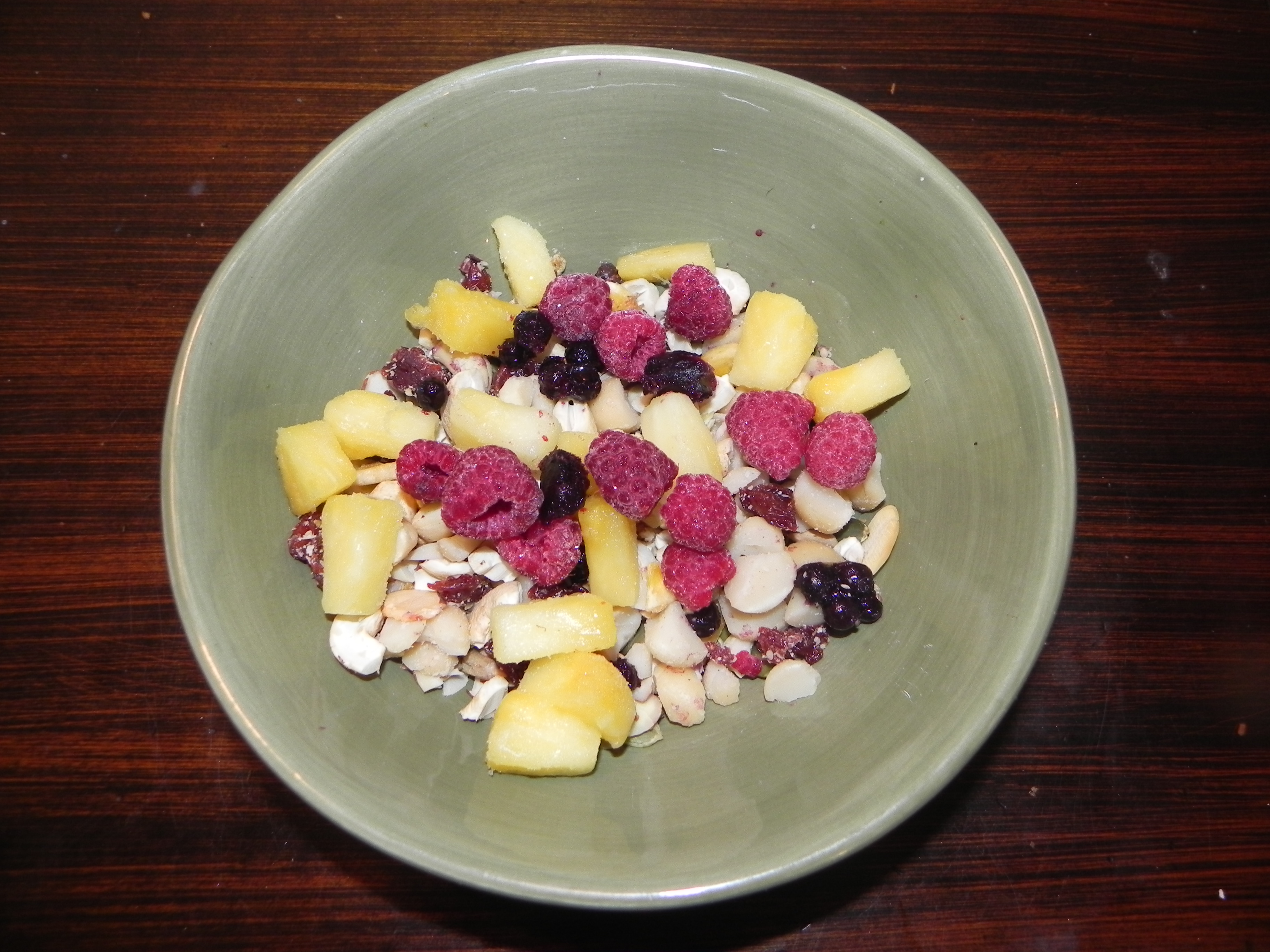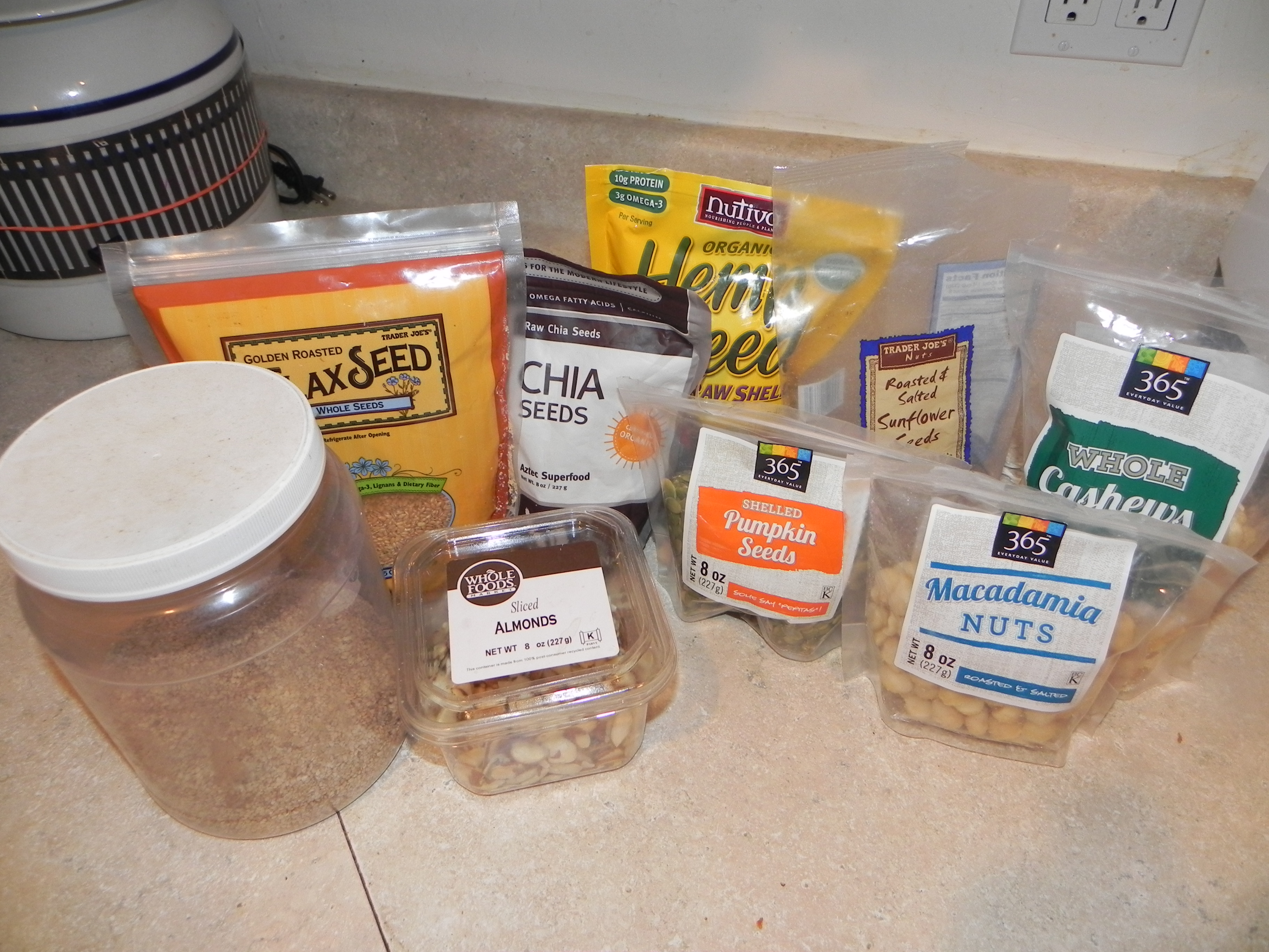 Based on Dr. Nick of Santa Barbara Family Chiropractic‘s “paleo cereal,” the kids and I did a little shopping – in the pantry. Like that old joke about Californians, we pulled out all the fruit, nuts (& seeds), and flakes that we could find. And this is what we came up with: