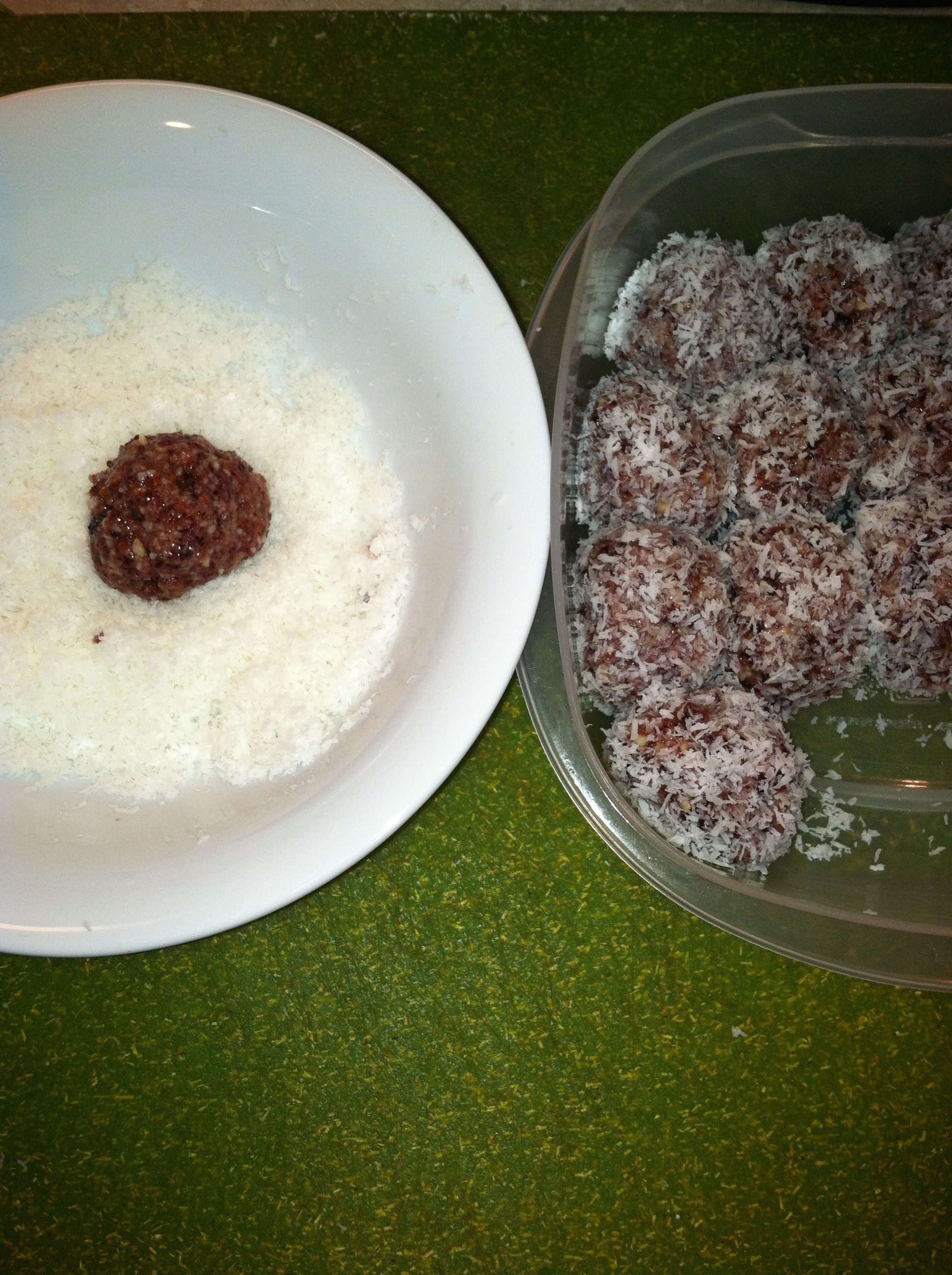 Form into bite-size balls and roll in a bowl of shredded coconut to cover. Chill and serve.